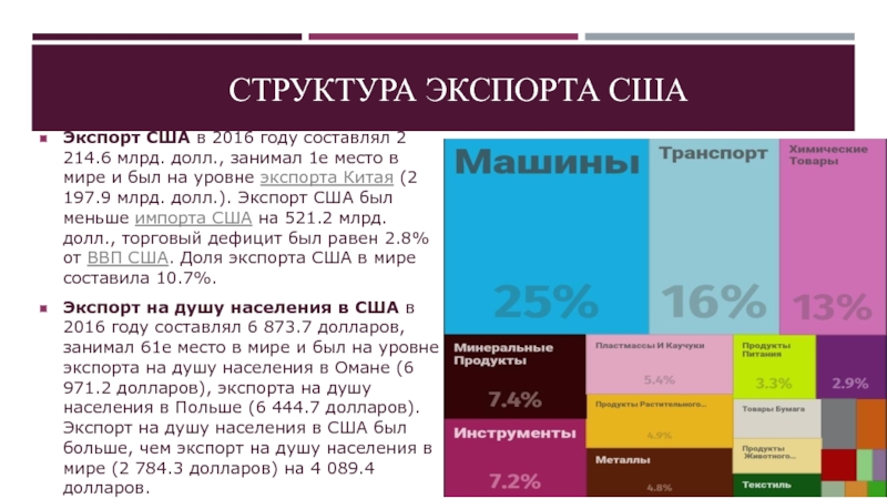 Китая (2 197.9 млрд. долл.). Экспорт США был меньше импорта США на 521.2 млрд. долл., торговый дефицит был равен 2.8% от ВВП США. Доля экспорта США в мире составила 10.7%.