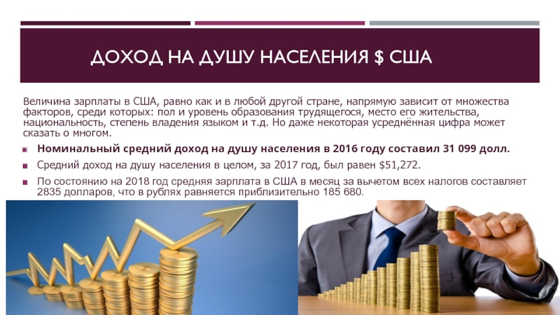 По состоянию на 2018 год средняя зарплата в США в месяц за вычетом всех налогов составляет 2835 долларов, что в рублях равняется приблизительно 185 680.