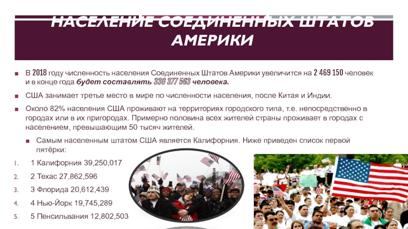 США занимает третье место в мире по численности населения, после Китая и Индии.