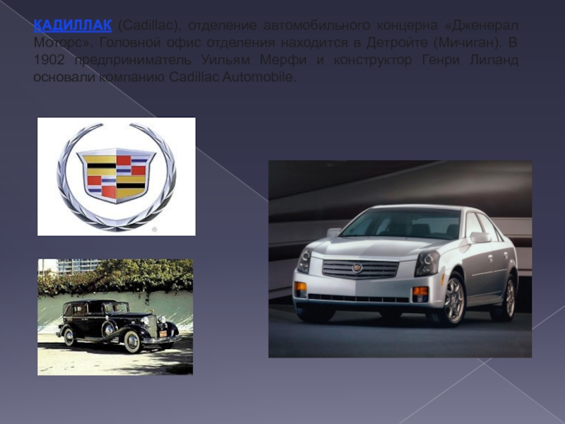 Слайд 13КАДИЛЛАК (Cadillac), отделение автомобильного концерна «Дженерал Моторс». Головной офис отделения