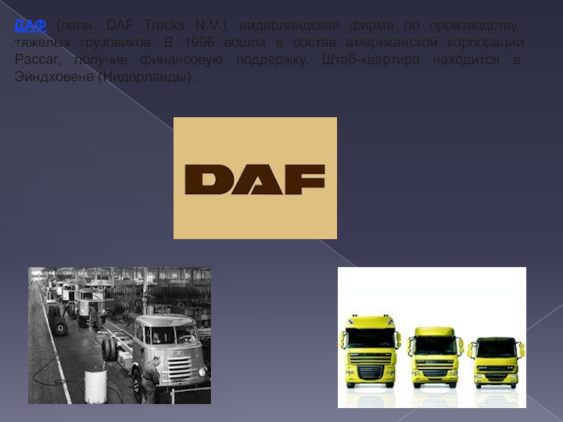 Слайд 17ДАФ (полн. DAF Trucks N.V.), нидерландская фирма по производству тяжелых