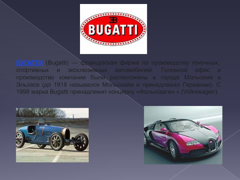 Слайд 9БУГАТТИ (Bugatti) — французская фирма по производству гоночных, спортивных и