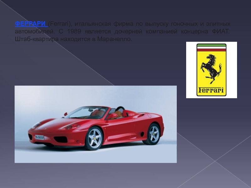 Слайд 31ФЕРРАРИ (Ferrari), итальянская фирма по выпуску гоночных и элитных автомобилей.