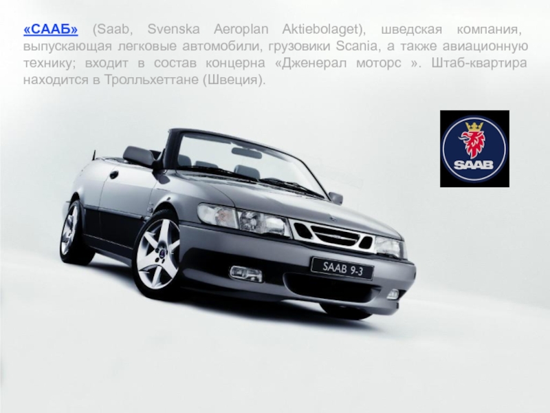 Слайд 26«СААБ» (Saab, Svenska Aeroplan Aktiebolaget), шведская компания, выпускающая легковые автомобили,