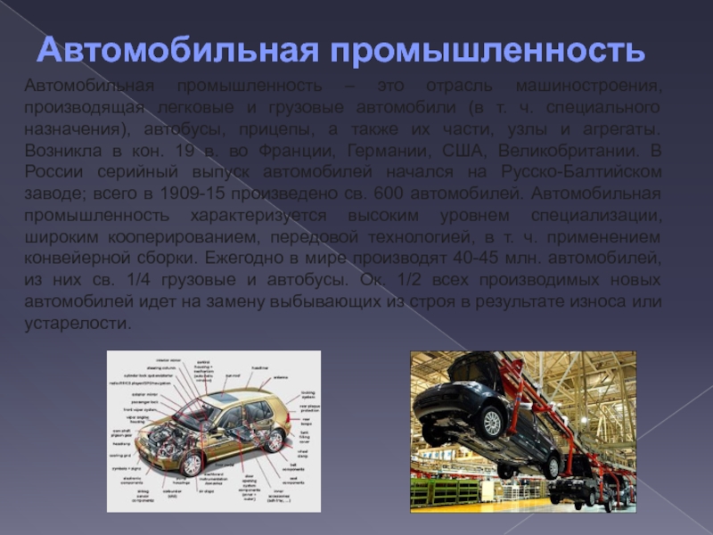 Слайд 2Автомобильная промышленность – это отрасль машиностроения, производящая легковые и грузовые