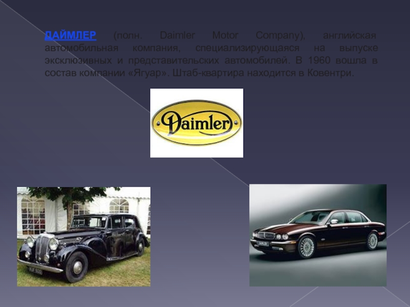 Слайд 16ДАЙМЛЕР (полн. Daimler Motor Company), английская автомобильная компания, специализирующаяся на