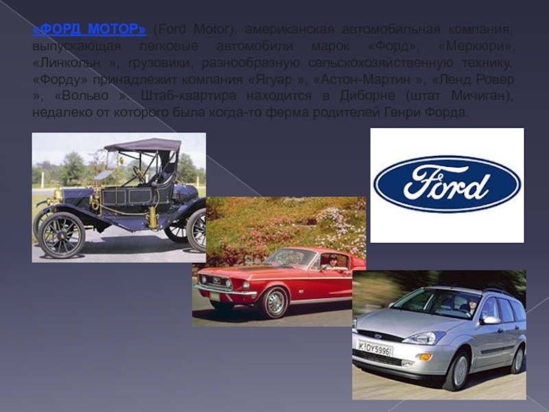 Слайд 33«ФОРД МОТОР» (Ford Motor), американская автомобильная компания, выпускающая легковые автомобили
