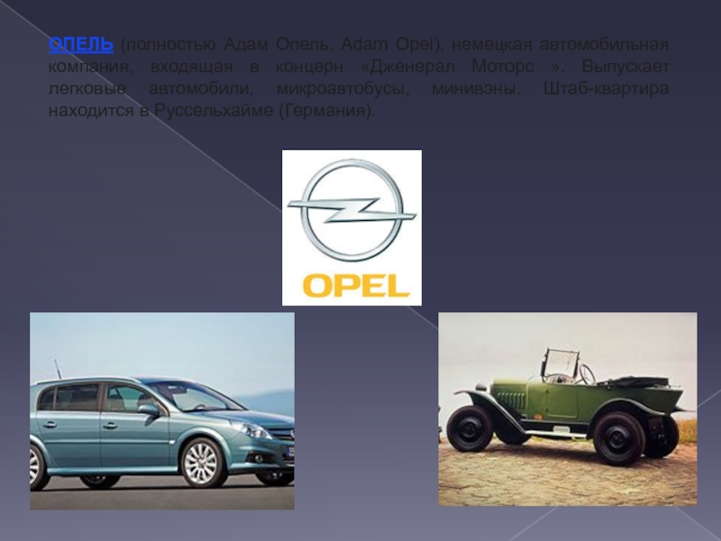 Слайд 21ОПЕЛЬ (полностью Адам Опель, Adam Opel), немецкая автомобильная компания, входящая