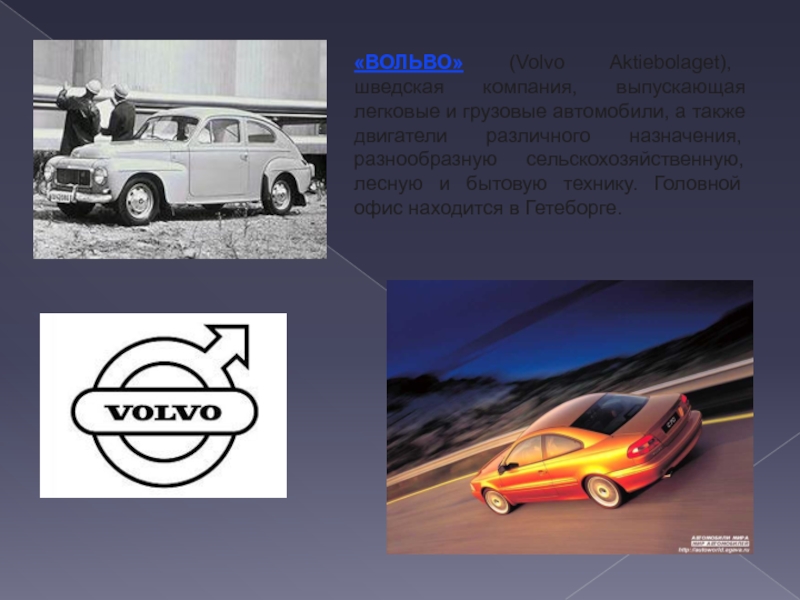 Слайд 15«ВОЛЬВО» (Volvo Aktiebolaget), шведская компания, выпускающая легковые и грузовые автомобили,