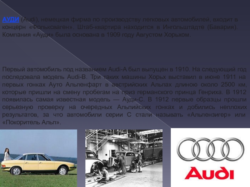 Слайд 4АУДИ (Audi), немецкая фирма по производству легковых автомобилей, входит в