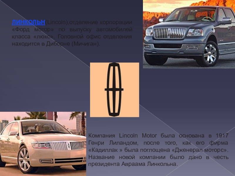 Слайд 6ЛИНКОЛЬН(Lincoln),отделение корпорации «Форд мотор» по выпуску автомобилей класса «люкс». Головной