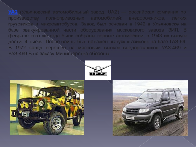 Слайд 30УАЗ (Ульяновский автомобильный завод, UAZ) — российская компания по производству