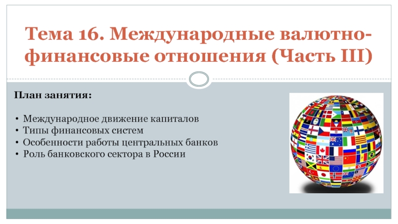 Тема 16. Международные валютно-финансовые отношения (Часть III)План занятия: Международное движение капиталов Типы финансовых систем Особенности работы центральных банков Роль банковского сектора в России