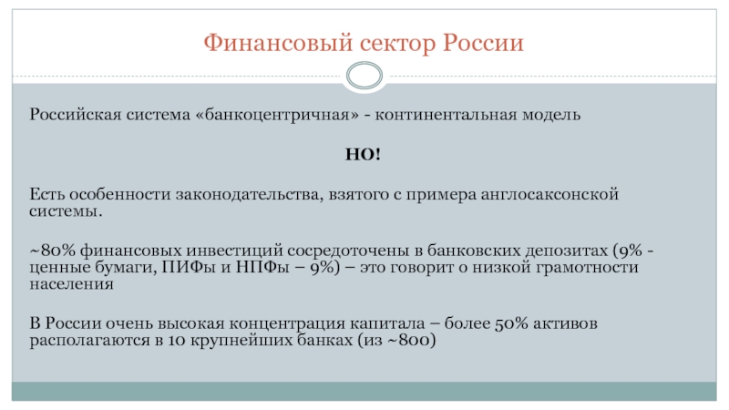 Финансовый сектор России Российская система «банкоцентричная» - континентальная модельНО!  Есть особенности законодательства, взятого с примера англосаксонской