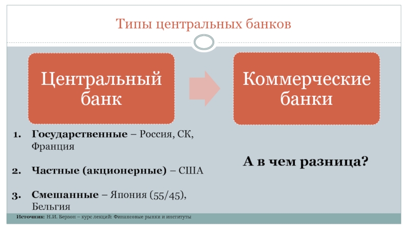 Типы центральных банковГосударственные – Россия, СК, ФранцияЧастные (акционерные) – СШАСмешанные – Япония (55/45), БельгияА в чем разница?