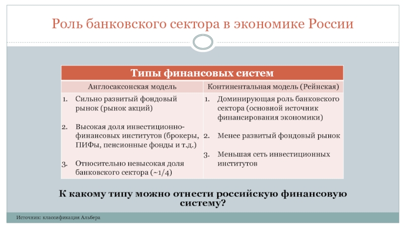 Роль банковского сектора в экономике РоссииК какому типу можно отнести российскую финансовую систему? Источник: классификация Альбера