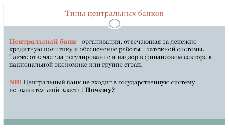 Типы центральных банковЦентральный банк - организация, отвечающая за денежно-кредитную политику и обеспечение работы платежной системы. Также отвечает