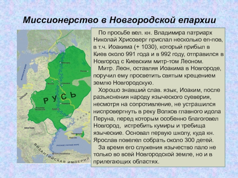 Митр. Леон, оставляя Иоакима в Новгороде, поручил ему просветить святым крещением землю Новгородскую.