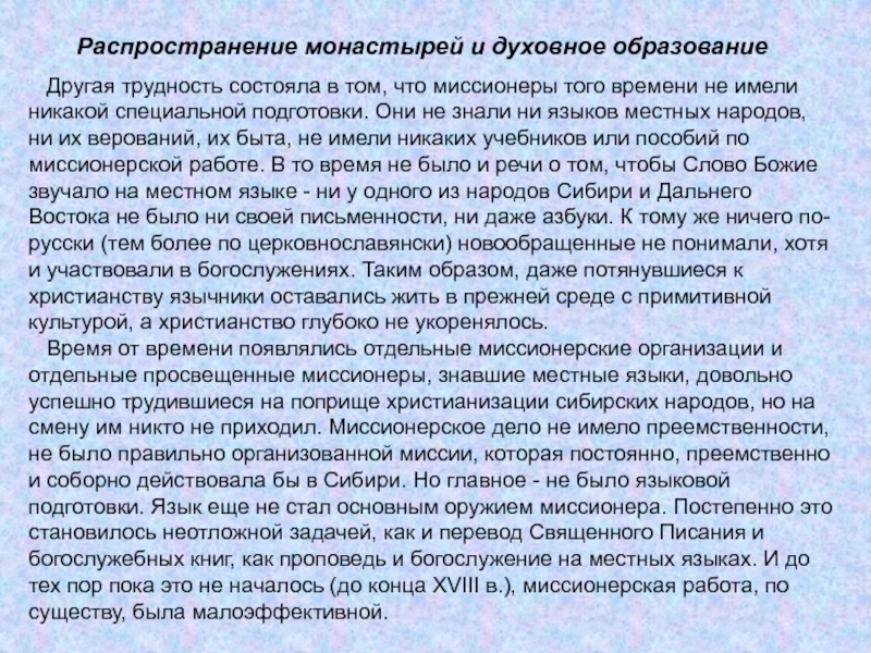 специальной подготовки. Они не знали ни языков местных народов, ни их верований, их быта, не имели никаких учебников или пособий по миссионерской работе. В то время не было и речи о том, чтобы Слово Божие звучало на местном языке - ни у одного из народов Сибири и Дальнего Востока не было ни своей письменности, ни даже азбуки. К тому же ничего по-русски (тем более по церковнославянски) новообращенные не понимали, хотя и участвовали в богослужениях. Таким образом, даже потянувшиеся к христианству язычники оставались жить в прежней среде с примитивной культурой, а христианство глубоко не укоренялось.