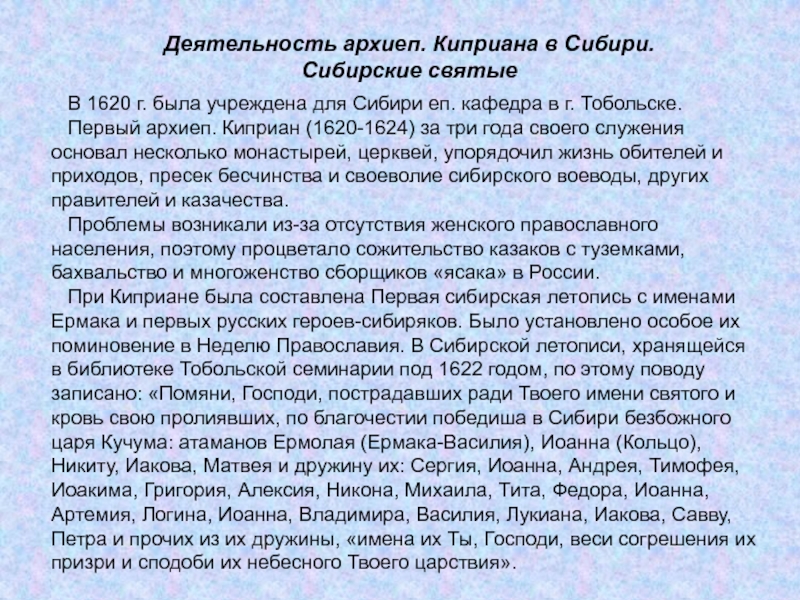 Деятельность архиеп. Киприана в Сибири. Сибирские святые.