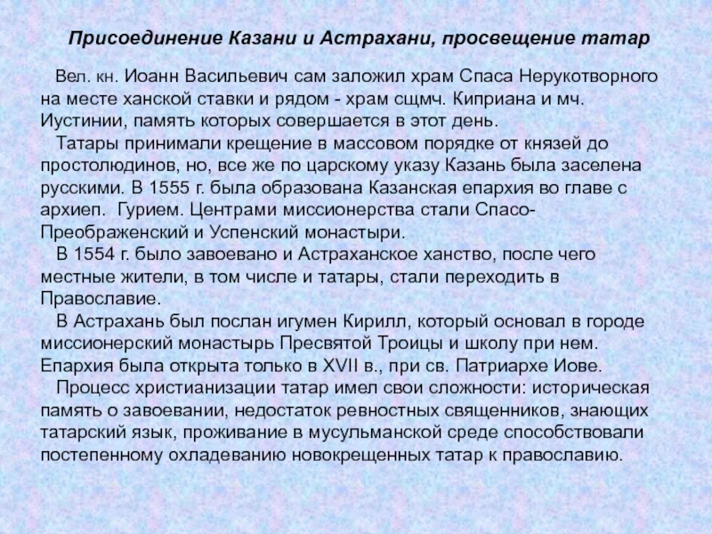 Татары принимали крещение в массовом порядке от князей до простолюдинов, но, все же по царскому указу Казань была заселена русскими. В 1555 г. была образована Казанская епархия во главе с архиеп. Гурием. Центрами миссионерства стали Спасо-Преображенский и Успенский монастыри.