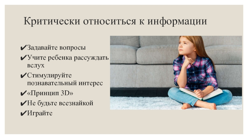 Критически относиться к информации Задавайте вопросыУчите ребенка рассуждать вслухСтимулируйте познавательный интерес«Принцип 3D»Не будьте всезнайкойИграйте