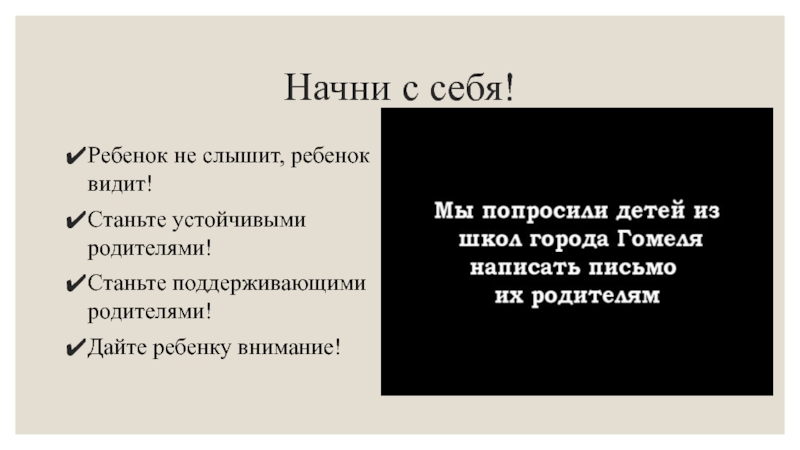 Начни с себя!Ребенок не слышит, ребенок видит!Станьте устойчивыми родителями!Станьте поддерживающими родителями!Дайте ребенку внимание!