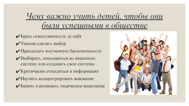 Чему важно учить детей, чтобы они были успешными в обществеБрать ответственность за себяУмение сделать выборПреодолеть выученную беспомощностьВыбирать,