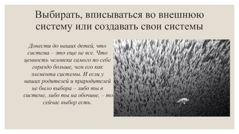 Выбирать, вписываться во внешнюю систему или создавать свои системы Донести до наших детей, что система – это