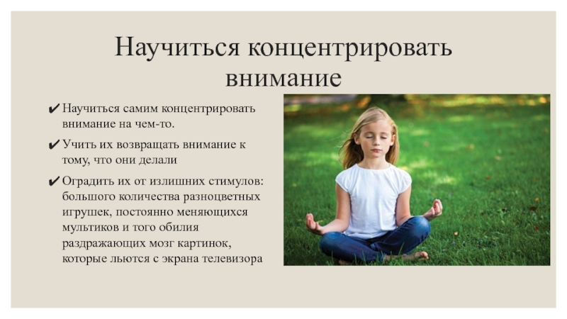 Научиться концентрировать вниманиеНаучиться самим концентрировать внимание на чем-то.Учить их возвращать внимание к тому, что они делалиОградить их