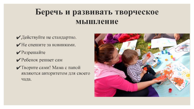 Беречь и развивать творческое мышление Действуйте не стандартно. Не спешите за новинками. РазрешайтеРебенок решает самТворите сами! Мама