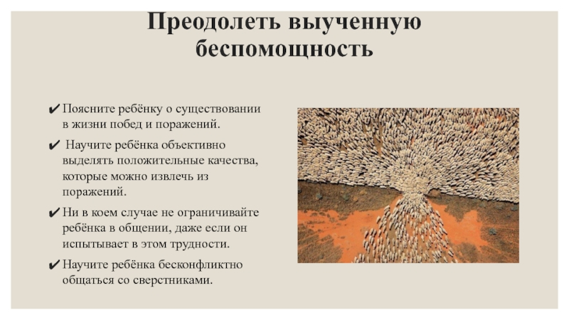 Преодолеть выученную беспомощность  Поясните ребёнку о существовании в жизни побед и поражений. Научите ребёнка объективно выделять