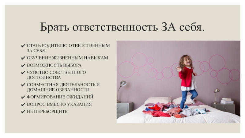 Брать ответственность ЗА себя.СТАТЬ РОДИТЕЛЮ ОТВЕТСТВЕННЫМ ЗА СЕБЯОБУЧЕНИЕ ЖИЗНЕННЫМ НАВЫКАМВОЗМОЖНОСТЬ ВЫБОРАЧУВСТВО СОБСТВЕННОГО ДОСТОИНСТВАСОВМЕСТНАЯ ДЕЯТЕЛЬНОСТЬ И ДОМАШНИЕ ОБЯЗАННОСТИФОРМИРОВАНИЕ
