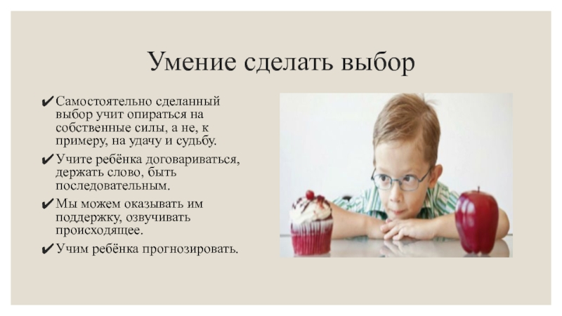 Умение сделать выборСамостоятельно сделанный выбор учит опираться на собственные силы, а не, к примеру, на удачу и