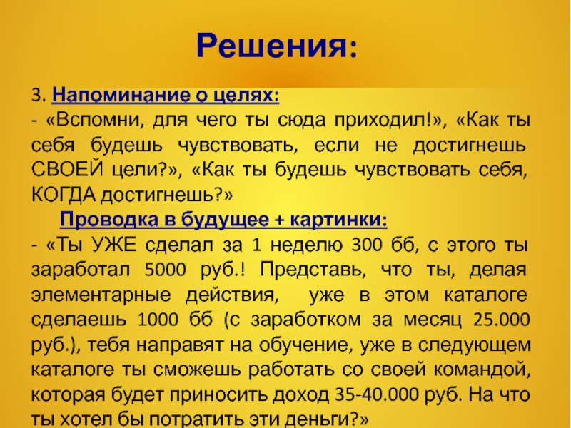 - «Ты УЖЕ сделал за 1 неделю 300 бб, с этого ты заработал 5000 руб.! Представь, что ты, делая элементарные действия, уже в этом каталоге сделаешь 1000 бб (с заработком за месяц 25.000 руб.), тебя направят на обучение, уже в следующем каталоге ты сможешь работать со своей командой, которая будет приносить доход 35-40.000 руб. На что ты хотел бы потратить эти деньги?»