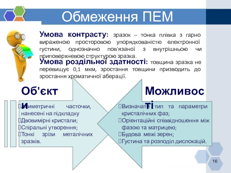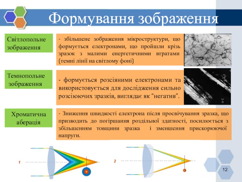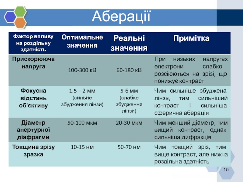 Умова роздільної здатності: товщина зразка не перевищує 0,1 мкм, зростання товщини призводить до зростання хроматичної аберації.