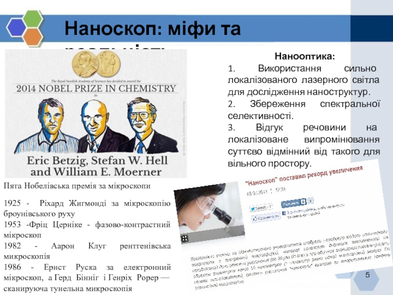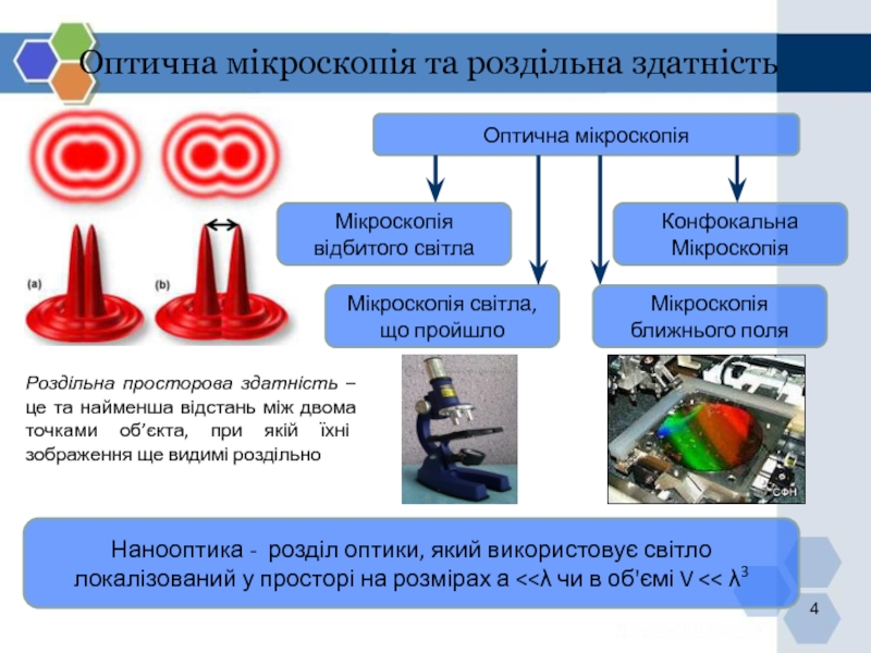 Нанооптика - розділ оптики, який використовує світло локалізований у просторі на розмірах а <<λ чи в об'ємі V << λ3