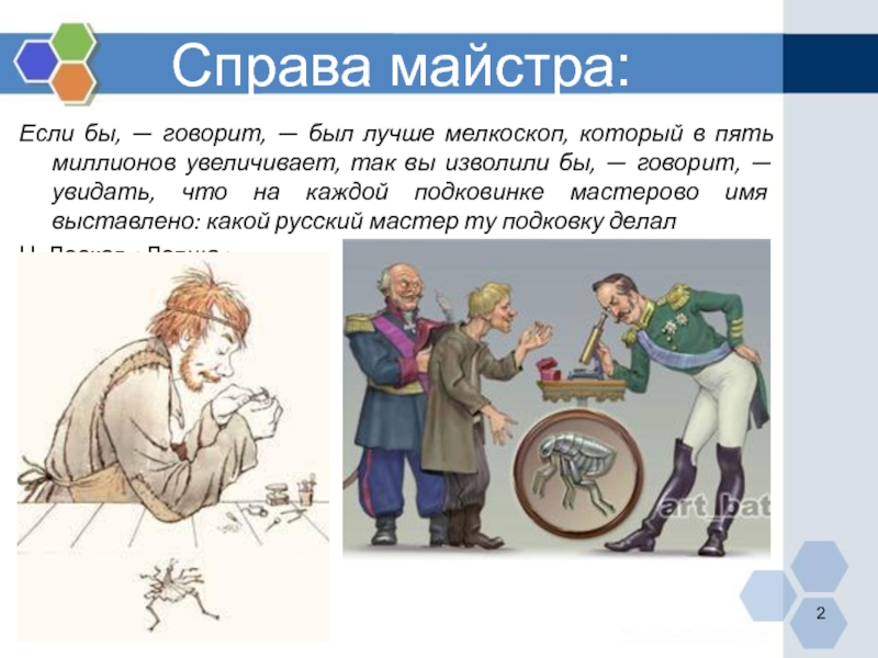 увидать, что на каждой подковинке мастерово имя выставлено: какой русский мастер ту подковку делалН. Лесков «Левша»
