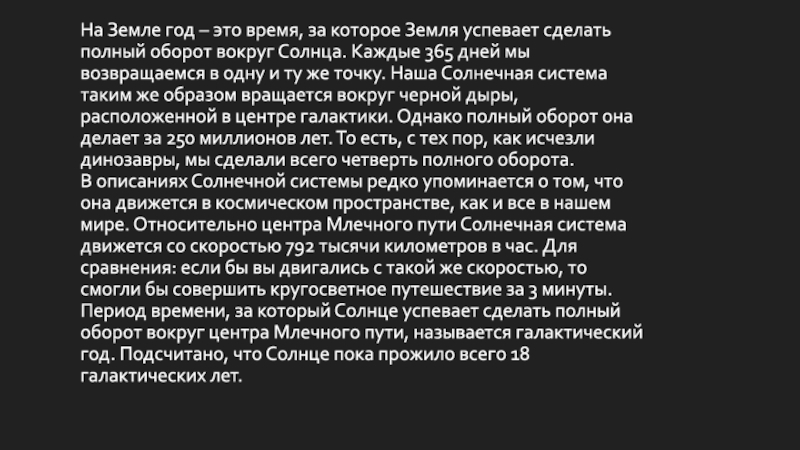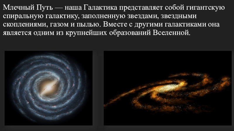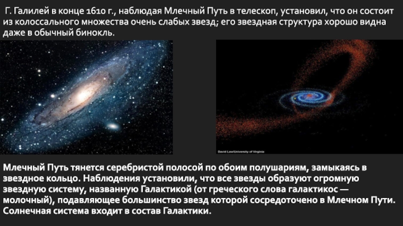 Млечный Путь тянется серебристой полосой по обоим полушариям, замыкаясь в звездное кольцо. Наблюдения установили, что все звезды образуют огромную звездную систему, названную Галактикой (от греческого слова галактикос — молочный), подавляющее большинство звезд которой сосредоточено в Млечном Пути. Солнечная система входит в состав Галактики.