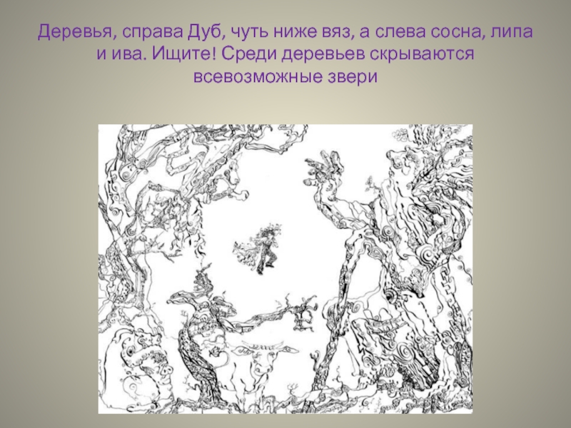 Деревья, справа Дуб, чуть ниже вяз, а слева сосна, липа и ива. Ищите! Среди деревьев скрываются всевозможные