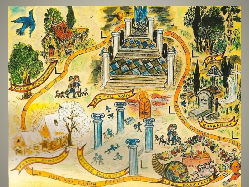 Слайд 1Иллюстрации к пьесе М.Метерлинка «Синяя птица»