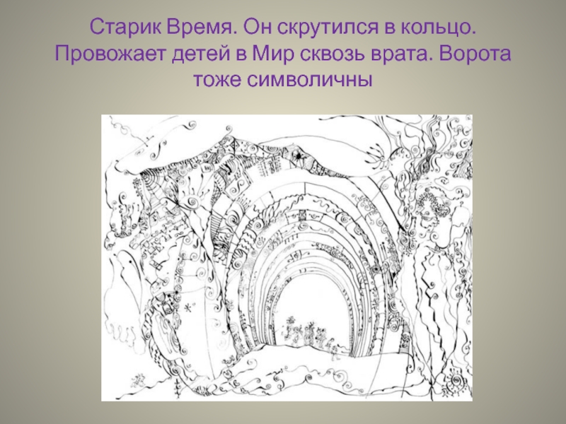 Старик Время. Он скрутился в кольцо. Провожает детей в Мир сквозь врата. Ворота тоже символичны