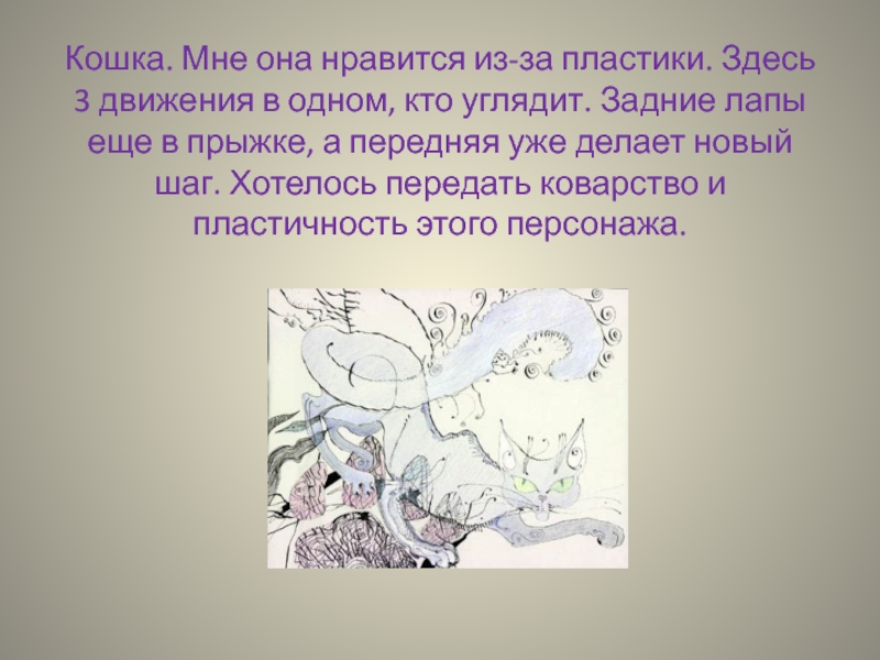 Слайд 12Кошка. Мне она нравится из-за пластики. Здесь 3 движения в