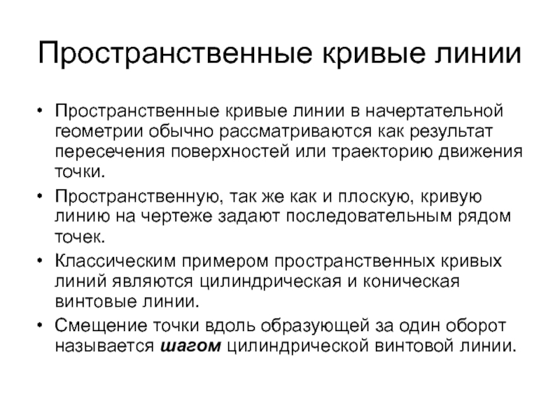 Классическим примером пространственных кривых линий являются цилиндрическая и коническая винтовые линии.
