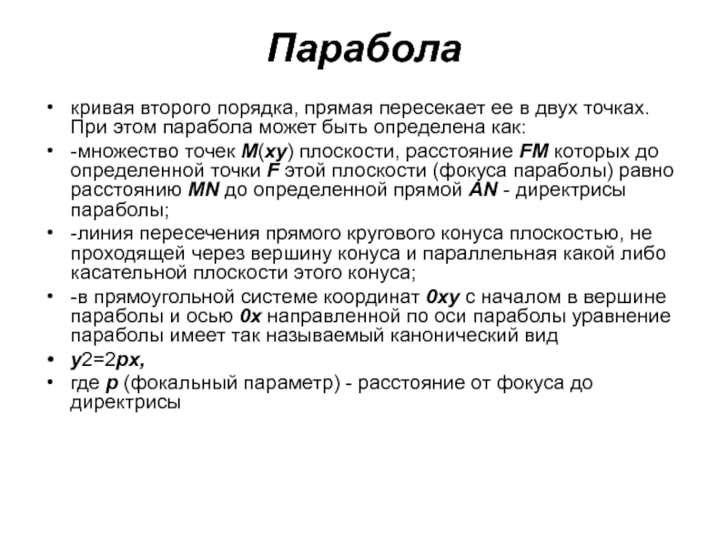 -линия пересечения прямого кругового конуса плоскостью, не проходящей через вершину конуса и параллельная какой либо касательной плоскости этого конуса;