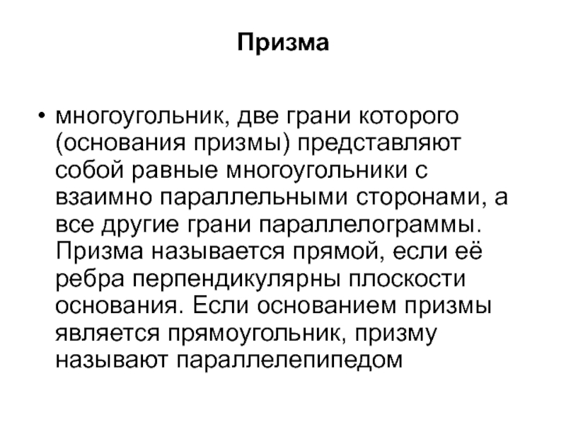 Призма называется прямой, если её ребра перпендикулярны плоскости основания. Если основанием призмы является прямоугольник, призму называют параллелепипедом