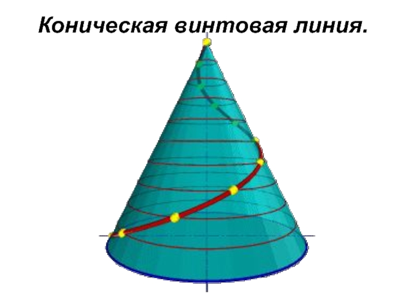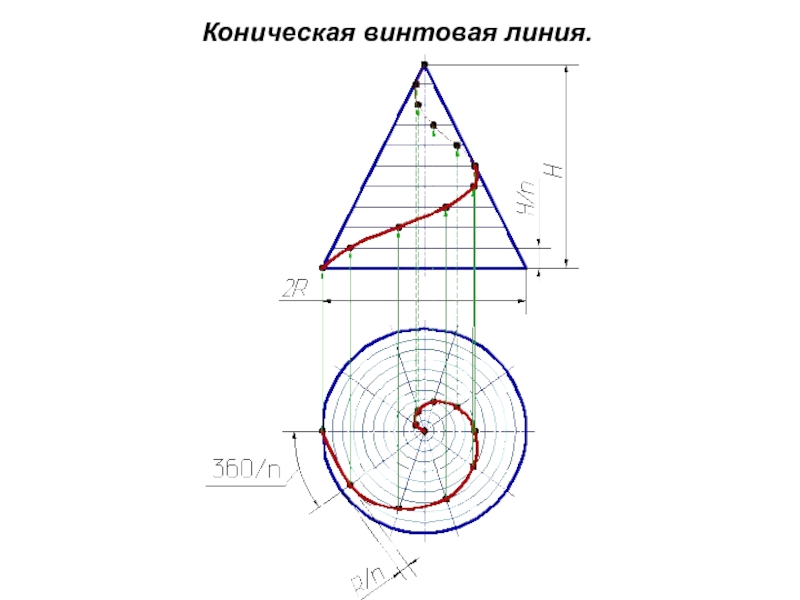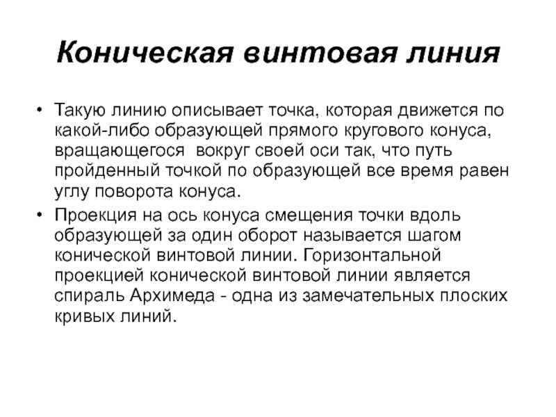 Проекция на ось конуса смещения точки вдоль образующей за один оборот называется шагом конической винтовой линии. Горизонтальной проекцией конической винтовой линии является спираль Архимеда - одна из замечательных плоских кривых линий.
