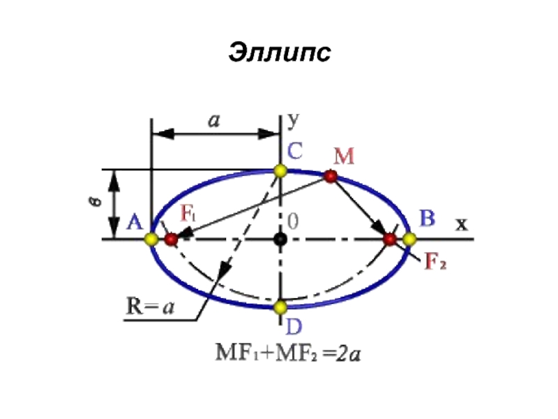 где а и в - длинны большой и малой полуосей эллипса. При а=в фокусы F1 и F2 совпадают и указанное уравнение определяет окружность, которая рассматривается как частный случай эллипса