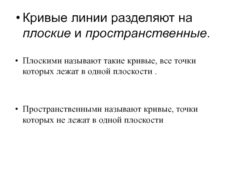 Слайд 33Кривые линии разделяют на плоские и пространственные.