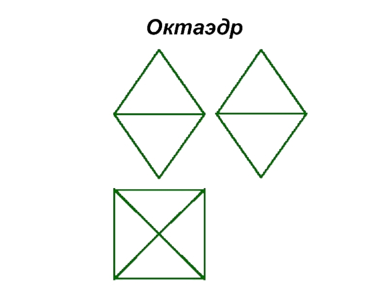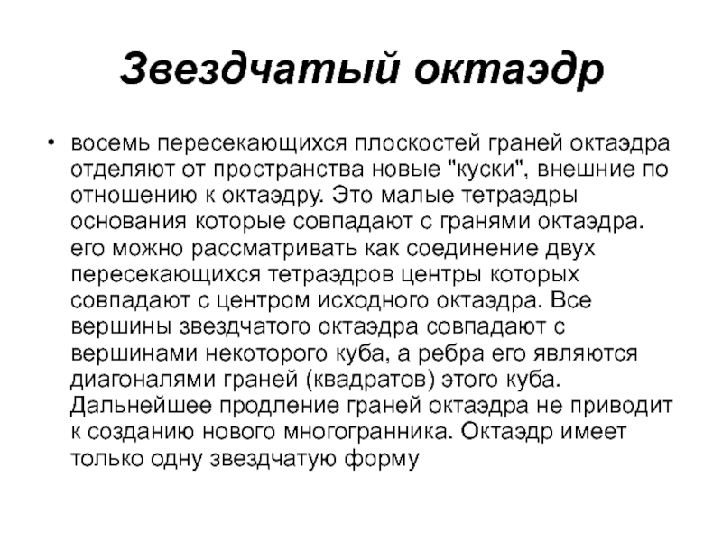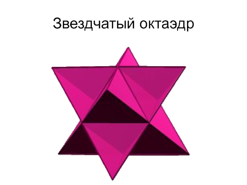 основания которые совпадают с гранями октаэдра. его можно рассматривать как соединение двух пересекающихся тетраэдров центры которых совпадают с центром исходного октаэдра. Все вершины звездчатого октаэдра совпадают с вершинами некоторого куба, а ребра его являются диагоналями граней (квадратов) этого куба. Дальнейшее продление граней октаэдра не приводит к созданию нового многогранника. Октаэдр имеет только одну звездчатую форму